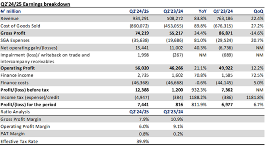 Finance income went up by 70.8% to 2.74bn, driven by interest on financial instruments. On the other hand, finance costs declined marginally by 0.6%. Overall, PAT rose by 9.12x to N7.44bn.