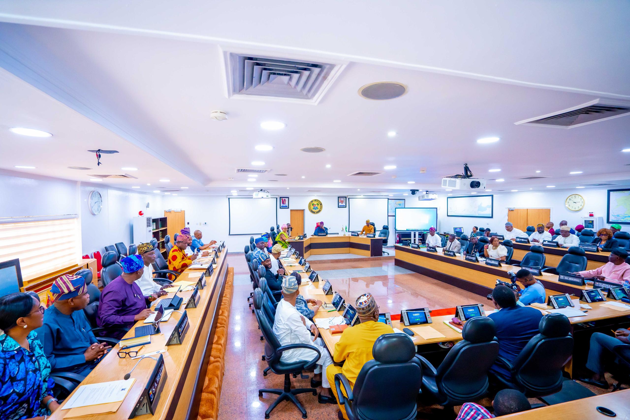 Right-Left: Lagos State Governor, Mr. Babajide Sanwo-Olu chaired the Executive Council meeting and with him are his Deputy, Dr. Obafemi Hamzat; Secretary to the State Government, Barr.Abimbola Salu-Hundeyin; and other members of the council, during the executive council meeting at the Lagos House, Ikeja, on Monday, 5th August 2024.