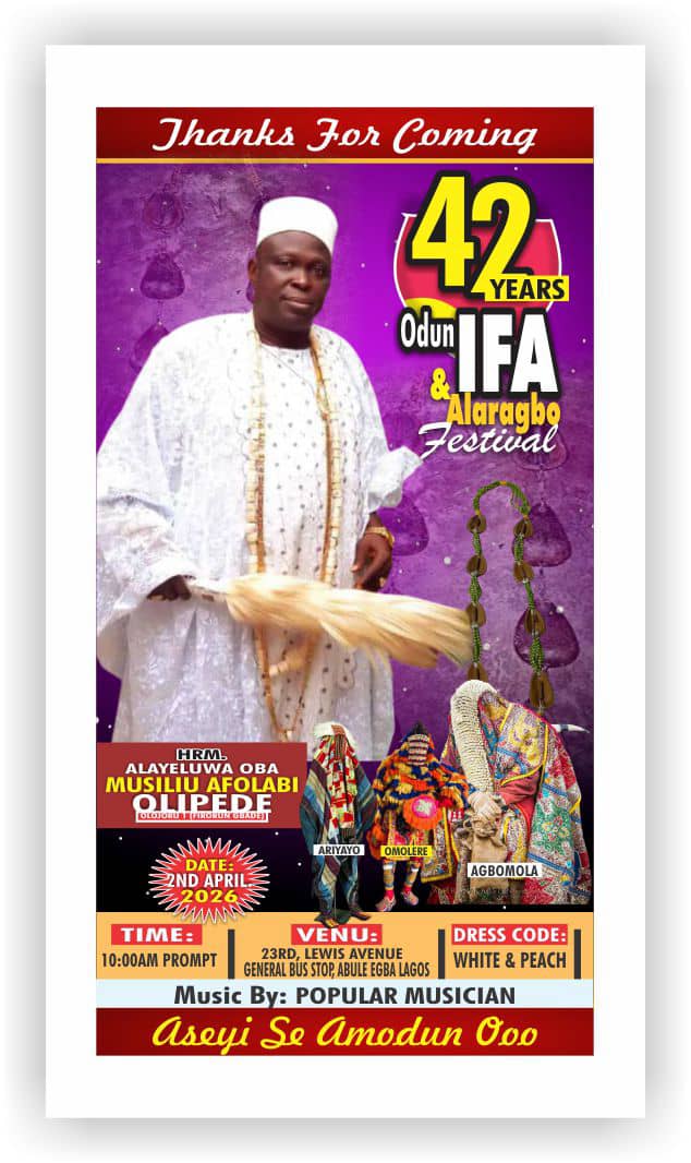 Traditional heritage and cultural pride will take centre stage in Abule Egba as His Royal Majesty, Alayeluwa Oba Musiliu Afolabi Olipede, celebrates the 42nd anniversary of the revered Odun Ifa alongside the vibrant Alaragbo Festival.
