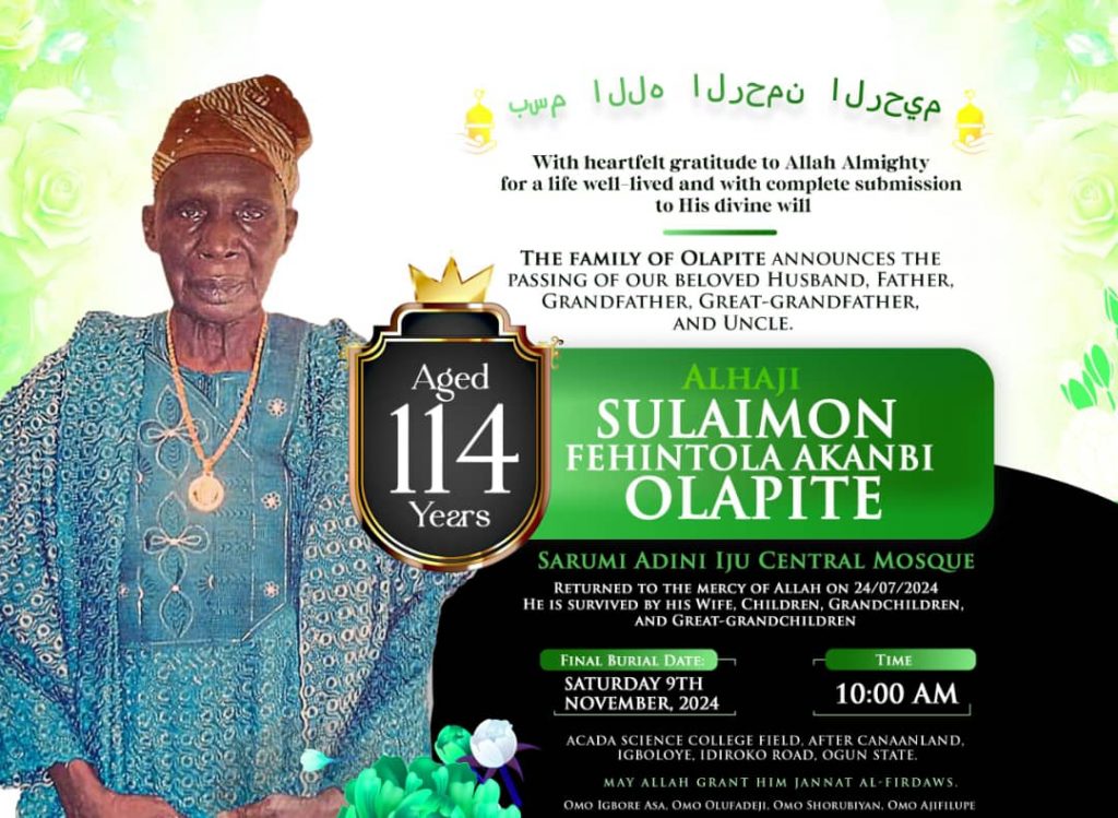 “But to have lived for 114 years, we believe the Almighty Allah had been gracious to him. And he was not a father who had to be carried from one hospital to another, he was called up to Almighty Allah and that is the testimonial that he had lived a good life and he had been at peace with humankind and also with his creator the way he left us peaceful and that reflects what Alhaji Sulaimon Fehintola Akanbi Olapite had been to each and every one of us.